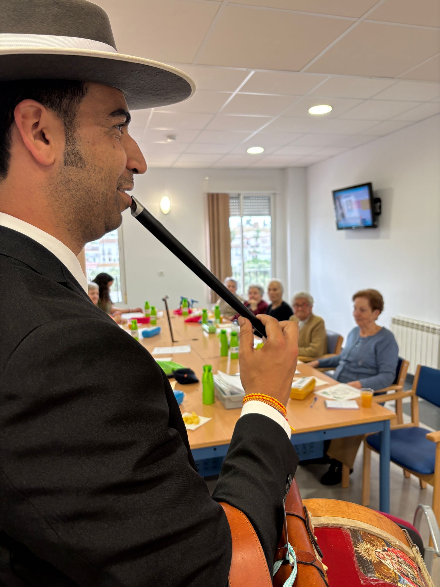 Las personas usuarias han podido disfrutar de la visita del tamborilero, cuyos sones han evocado recuerdos y emociones vinculados a la romería, generando un ambiente cercano y participativo dentro del centro.